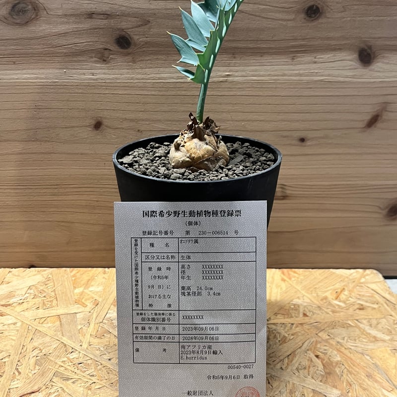 | 商品の特徴 | エンセファラルトス ホリダス | GREEN LUCK。エンセファラルトス ホリダス 南アフリカ産 国内フラッシュ株 エン。エンセファラルトス ホリダス | GREEN LUCK。他から話しがかりがあった場合、出品を停止する場合があります早い者勝ちとなっておりますご了承くださいませ現在 葉は4本生えております。 詳細は下記「注意事項」をご参照ください。登録を受けた国際希少野生動植物種の個体等の譲受けた場合は、その所在を明らかにする為に登録機関に対し、その旨を届出ることが義務づけられています。http://www.jwrc.or.jp/service/cites/regist/yuzuriuke.htmまた、登録には5年の有効期間が設定されており、5年の有効期間が過ぎると登録は失効します。更新時には更新料が必要となります。http://www.jwrc.or.jp/service/cites/regist/kotai/koushin.htm◾️容認事項以下のことを容認のうえご購入ください。・気温等の環境の変化により葉を落とす場合があります。・航空便は取り扱いが雑になる為、離島への発送は行っておりませんが、ご希望される場合は、発送に問題が生じても責任を負えないことをご了承ください。エンセファラルトス ホリダス 南アフリカからやってきた とても希少な。更新R7.09.11【南アフリカ産】エンセファラルトス・ホリダス◾️商品説明・南アフリカ産・サイズ:塊根部約6.3cm・発根済み・国内で展開した新葉です・登録記号番号は写真をご確認下さい 商品の受取後、速やかに名義変更手続きをお願いします。ペラルゴニウム ミラビレ。アデニウム・アラビカム ドワーフタイプ 中型 塊根植物 黒鉢。◾️注意事項ワシントン条約付属書I(CITES I)に分類されている、国際取引が厳重に規制されている希少な植物で、種の保存法により国際希少野生動植物種の登録が義務づけされております。グラキリス 現地球 発根済み。レア種❗️アデニウム 獅子葉 ドーセットホーン コーデックス アラビカム 塊根植物。受け取り後、速やかに届出を行なってください。亀甲竜 Dioscorea elephantipes 実生株 たけろうポット。セ*道様 K14「球根植物」ブーファン ハエマンソイデス 産地株 20株。登録は有効期間が満了する前に更新を行うことができます。【現物・美株】モンソニア ペニクリナム 中株 サルコカウロン ペニクリナ。BP92 オペルクリカリア パキプス コーデックス ベアルート株。詳細は、自然環境研究センターのHPをご確認ください。【美株/鉢ごと】モンソニア ムルチフィダ (4株セットの右端④)。大特価!早いもの勝ち! アデニア グロボーサ。・配送の段階で土がこぼれ出ることがあります。【コレクション株】チレコドン ペアルソニー “白象 “発根済 現地球。【美株/鉢ごと】モンソニア ムルチフィダ (4株セットの右から2番目③)。・生きた植物のため到着までの状態が変化する場合があります。パキポディウム ビスピノーサム 巨大 低身まんまる 発根済み。【週末限定価格】【実生10年以上】【鉢ごと発送】フォークイエリア プルプシー。#エンセファラルトス#ホリダス#塊根#塊根植物#多肉植物#コーデックス特徴···現地球/現地株 | ||